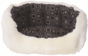 Die „Sommerseite“ ist aus einem braunen Bezug mit schwarzen Quadraten ausgestattet (Polyester/Viscose) und die „Winterseite“ mit beigem Plüsch-Pelz (Polyester). Gefüllt ist das Bett mit Polyester Kunstfasern und bietet somit bequemen Liegekomfort.