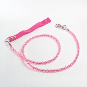 Diese Leine besticht als erstes ganz klar durch ihre Optik. Sie besteht aus einem strapazierfähigen Metallseil, welches mit funkelnden, geschliffenen Acrylperlen in verschiedenen Grössen besetzt ist. Die Halterung ist aus einem farblich abgestimmten Nylongurt gefertigt.