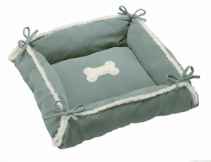 Durch das öffnen der Schlaufen an den Ecken kann die Liegefläche vergrössert werden. In der Mitte ist ein Knochen aus Lammfell-Imitat aufgenäht.